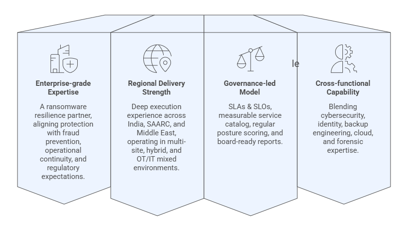 We operate with a 24×7 enterprise delivery model across India, SAARC, and the Middle East aligned with ransomware threat patterns, CERT-In requirements, and business continuity needs.
