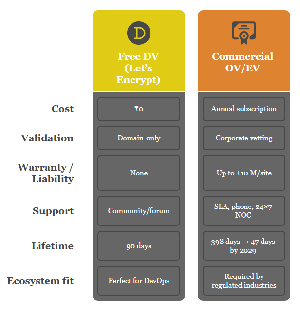 Recommendation: Adopt free DV where identity assurance is non-critical and automation is in place; retain commercial OV/EV for regulated workloads, brand trust requirements, or high indemnity needs.globalsign.commilesweb.com
